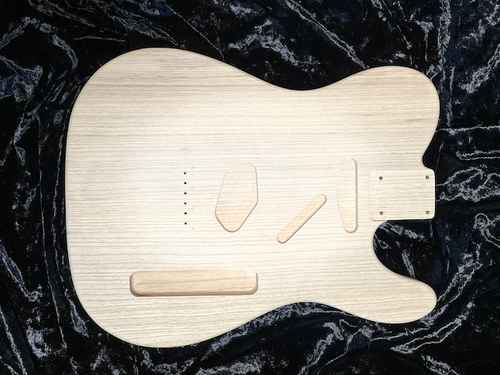 完成したギター全体の重さは、ネックの重量やハードウェア(ペグ・ブリッジ・電装)の重量、塗装の厚み等の影響を受けるため、ここからボディ単体の重さを正確に割り出すことはできません。