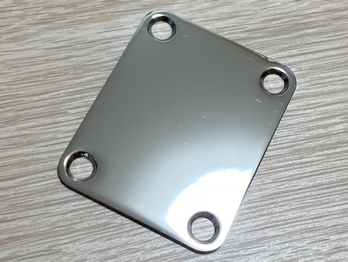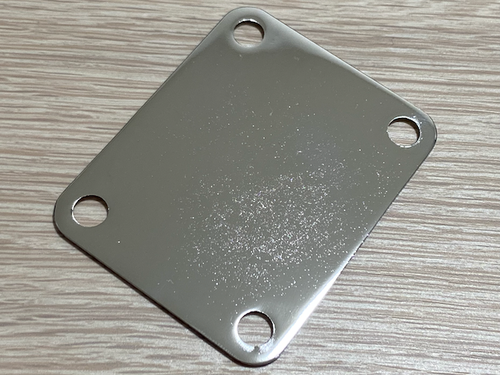 市販のネックプレートのほとんどがオールドよりも厚みのある素材を使っていますが、素材の厚みが増すほど基音が高域にシャープしていきます。また、不思議なことにオールドと同じように1.5mm厚のスチールにクロムメッキを施してもオールドに比べて基音がシャープしてしまい、狙ったサウンドに至らなかったため、今回はめっきをニッケル-クロムにしたらどうなるか?と考えて製作したのですが、めっき業者が誤って銅めっきの下地を施してしまったため、格安で放出します。